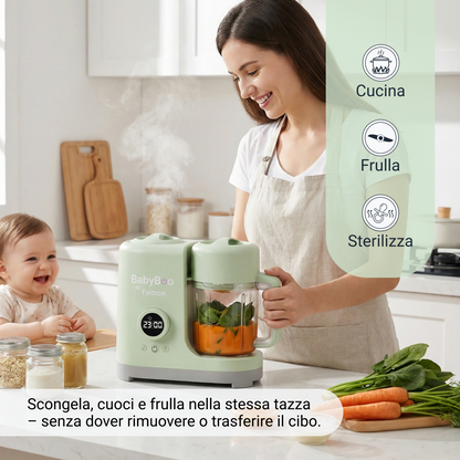 Cuoci, riscalda, cucina al vapore, frulla, sterilizza, scalda e scongela tutto in un unico apparecchio. Perfetto per frutta, verdura e carne, ti permette di creare qualsiasi consistenza e alimento per bambini.