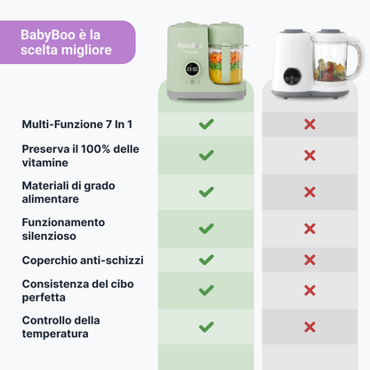 Grazie a ricerche, test e sviluppi approfonditi, BabyBoo offre uno dei modi più avanzati e convenienti per nutrire il tuo bambino, progettato per aiutare a preservare vitamine e sostanze nutritive, dal latte ai primi pasti e oltre.