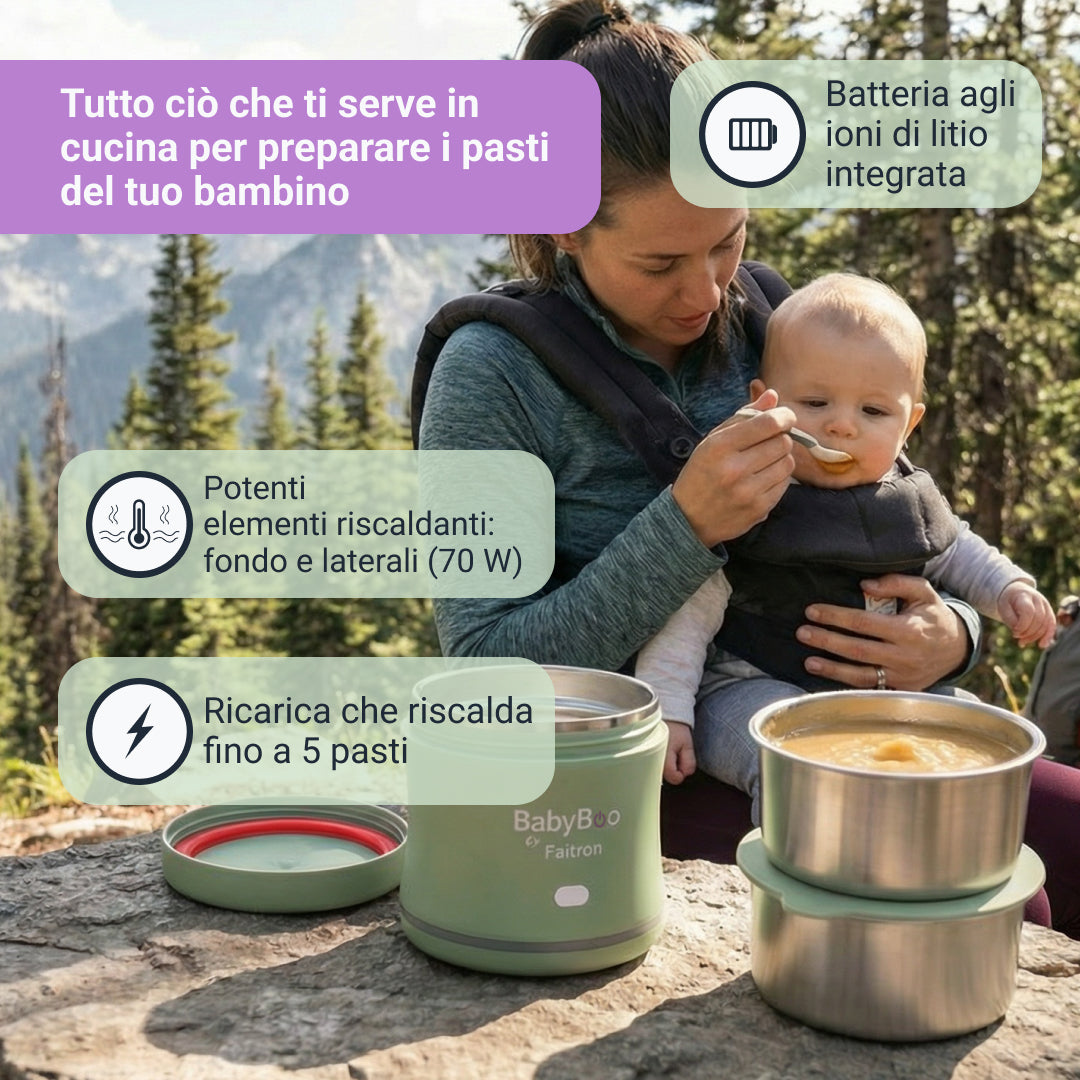 Lo scaldapappa più veloce al mondo. L'ora della pappa richiede una risposta rapida. Riscalda gli alimenti per il tuo bambino in soli 5 minuti. Sempre e ovunque con la batteria.