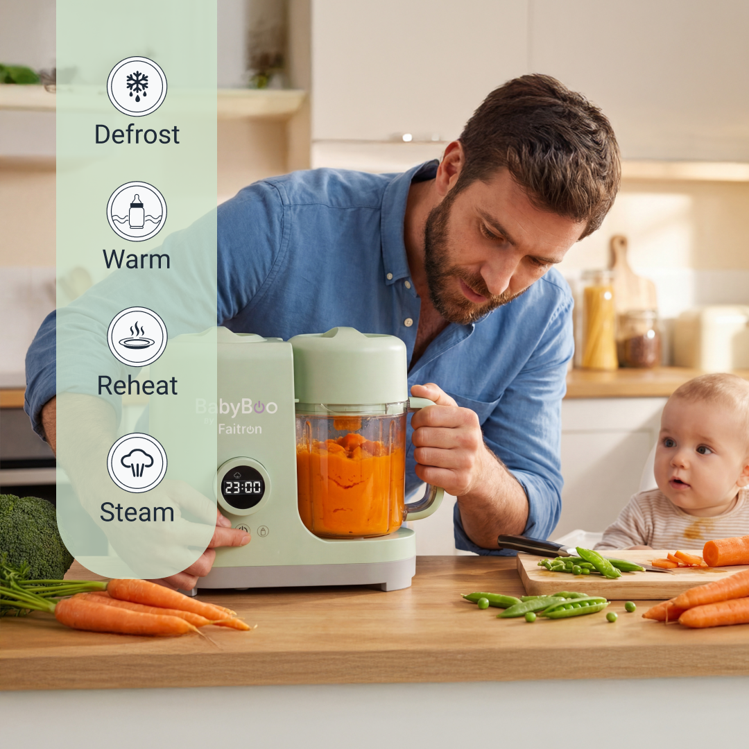 The BabyBoo 7-in-1 Food Maker brings every step of baby food preparation into one smart device. Cook, steam, blend, reheat, sterilize, warm and defrost with ease, while creating fresh homemade meals in minutes. Innovative technology to help preserve vitamins, nutrients and perfect texture.