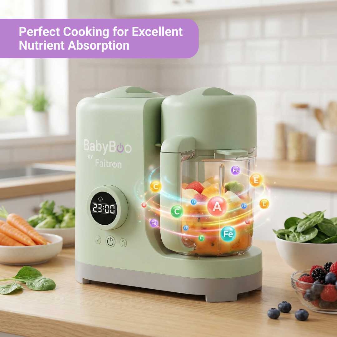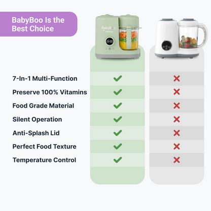 Instead of multiple devices, the BabyBoo Food Maker combines every essential function into one perfectly sized processor with advanced technology, trusted as a must-have by many moms and dads.